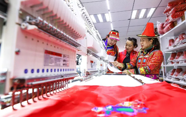 Yugur clothing inheritor Pan Xiaohong teaches enthusiasts how to use newly introduced embroidery machines at the Intangible Cultural Heritage Master Studio in Sunan Yugur autonomous county, Zhangye, Gansu province, on Dec 23, 2024. [Photo provided to gogansu.com]