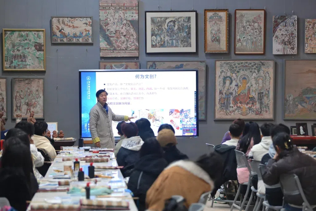Wang Quanchao explains creative cultural designs inspired by Dunhuang murals to domestic and international students at Jiuquan Vocational and Technical College in Jiuquan, Gansu province, Jan 14, 2025. [Photo provided to gogansu.com]